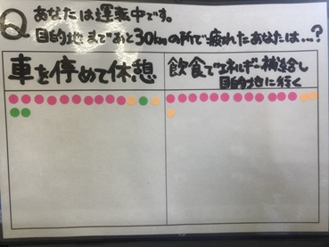 A. 車を停めて休憩 B. 飲食でエネルギー補給してそのまま運転